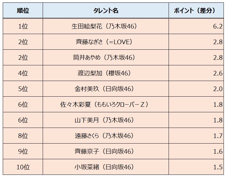 タレントパワーランキングの2021年5月度調査結果から、認知度(知名度)が上昇した女性アイドル個人(調査対象に登録されているメンバー)のTOP10を紹介します。
