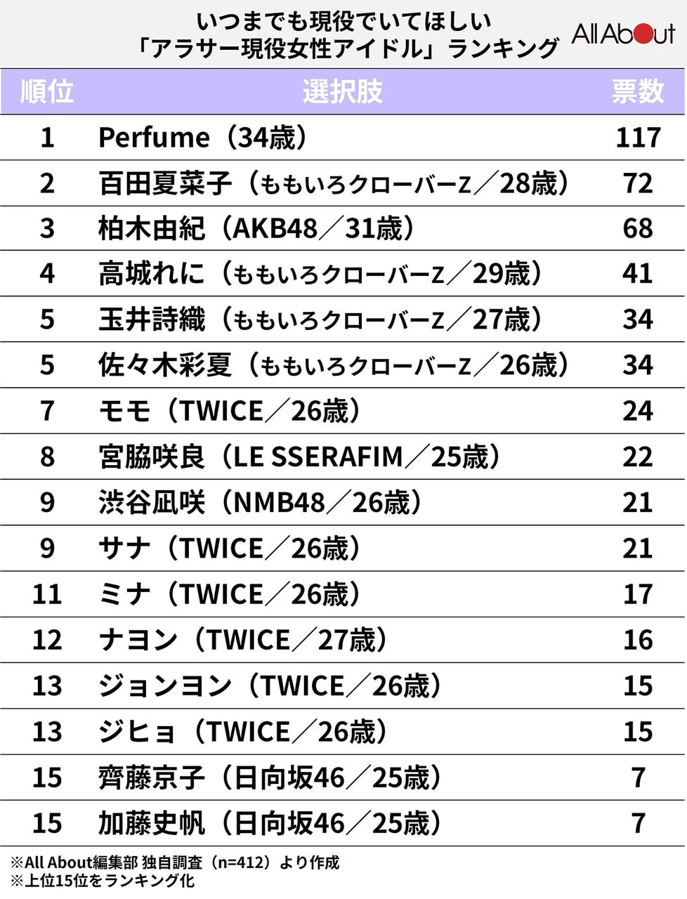 2位Perfume 39票(アラサー3人)